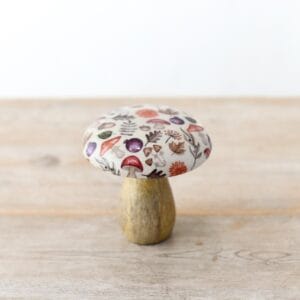 mango wood mushroom with glazed top decorated in beautiful autumnal designs. 10cm tall.